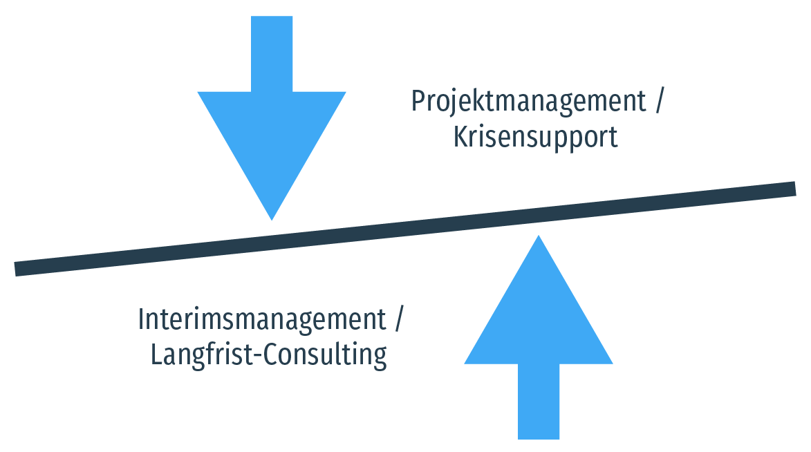 Unser Ziel ist es nicht nur, unsere Kunden durch Konzepte, Strategien und Ratschläge zu unterstützen, sondern durch „aktives Management auf Zeit“ zu entlasten sowie zum Beispiel bei Change-Phasen gezielte Managementbereiche zu übernehmen.
